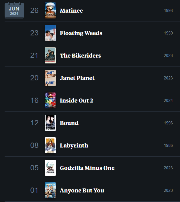 That alone took up plenty of nights, but also catching up with the latest seasons of Bridgerton and The Bear, playing some video games, and other summer festivities left little time for movie watching. Long-time listeners of the It’s the Pictures podcast would probably be unsurprised to learn that my favorite new watch of June was a Yasujiro Ozu movie. I’ll probably have more to say about Floating Weeds soon, but Ozu just makes fantastic movies. Don’t just take my word on it—Roger Ebert also loved the work of Ozu.