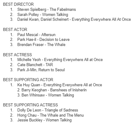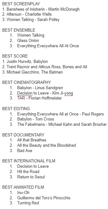 I also contributed to the BOFCA (Boston Online Film Critics Association) awards this year. The Banshees of Inisherin won that group’s top honor as well. I’ve included how I planned to vote in other categories (outside of Best Movie) below: