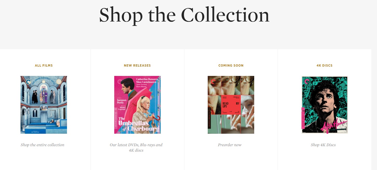 From the Criterion website, “Since 1984, the Criterion Collection has been dedicated to publishing important classic and contemporary films from around the world in editions that offer the highest technical quality and award-winning, original supplements. No matter the medium—from laserdisc to DVD, Blu-ray, 4K Ultra HD to streaming—Criterion has maintained its pioneering commitment to presenting each film as its maker would want it seen, in state-of-the-art restorations with special features designed to encourage repeated watching and deepen the viewer’s appreciation of the art of film.”