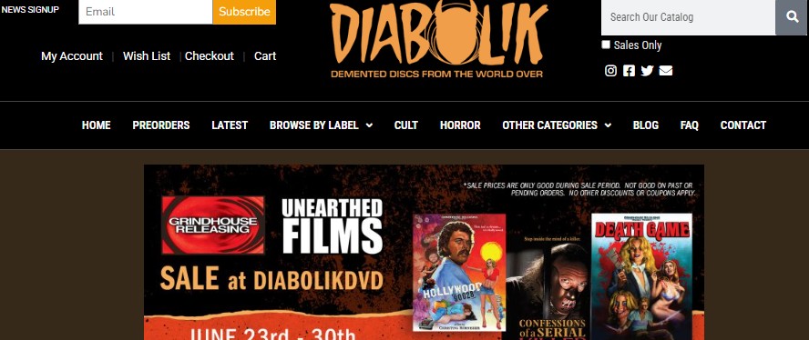 DiabolikDVD is operated out of New Jersey by Jesse Nelson and Joe Gervasi. Their store specializes in horror/cult/exploitation releases, but they also have titles from Criterion and Kino, as well as international releases.
