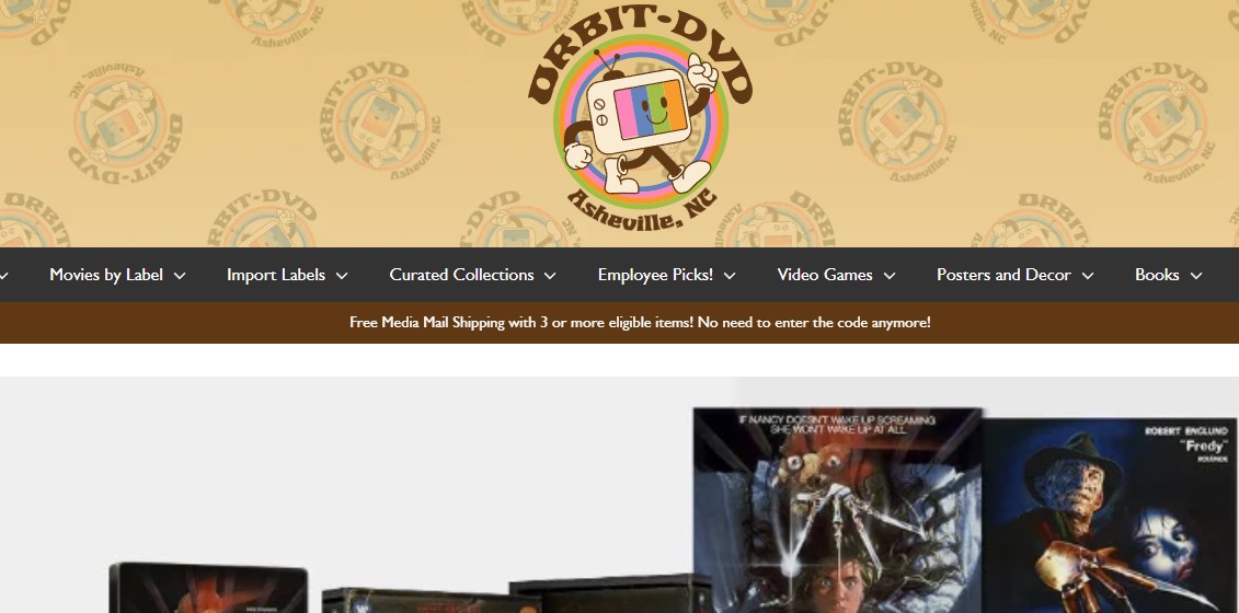OrbitDVD is a video store that has been open for more than 20 years in Asheville, North Carolina. They sell a wide range of items, including 4K discs, imported movies, video games, unusual books, and more. They have free media mail shipping if you order three or more eligible items.